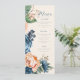 A bright, bold floral of roses in shades of dusty blue and peach is the focal point for many of the pieces of this wedding suite that also features elegant script text and modern design layouts. The wedding menu shown here has a side border of roses and a beautiful watercolor abstract on the reverse in dusty blue. Easily enter your personal menu details, wedding date and bride and groom's initials using the provided template. Search ID584 to see all the matching pieces in this beautiful wedding set.
