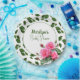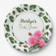 Pink roses bridal shower paper plates with text in the centre.  The layered look design has a rose leaves pattern, a round white centre for the text, and a bunch of pink roses with buds.  The bride’s name is in bolder text, with the name of the party in a thin, modern font.  This works on round or square plates.