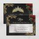 This RSVP card features a red rose floral spray on black embellished with gold leaves corners. The front has details for the recipient to fill out and the back has the young lady's name with a tiara. Designed to coordinate with the "Floral & Gold Leaves - Black & Pearl" Quinceanera Collection. To change details, click «Personalize». To move the text or change the text size, font, or color click «Click to customize further»