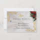 This RSVP card features a red rose floral spray on pearl white embellished with gold leaves corners. The front has details for the recipient to fill out and the back has the young lady's name with a tiara. Designed to coordinate with the "Floral & Gold Leaves - Black & Pearl" Quinceanera Collection. To change details, click «Personalize». To move the text or change the text size, font, or color click «Click to customize further»