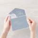 Delicate white Roses silhouettes on a soft dusty blue background give this budget-friendly, all-in-one wedding invitation a trendy, modern look. The tear-off RSVP is a mailable card, or your guests can just scan the customisable QR code for all you wedding details.