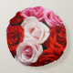 A round pillow featuring roses in red, pink and white. Perfect for rose lovers.