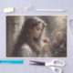 This ethereal portrait captures the intimate moment between a young woman and a blooming rose, rendered in the dreamy style of Pre-Raphaelite masterworks. The composition showcases luminous contrasts between the subject's flowing dark curls and her gossamer white dress, while coral roses provide delicate colour accents against misty atmospheric shadows. The softly diffused light creates an almost otherworldly glow around the figure, suggesting a moment suspended in time.