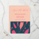 This card showcases a set of flat modern roses on a black surface. At the top there is a customisable light salmon box with this pink inscription: "save the date", "formal invitation to follow", name of the couple and place and date of marriage.