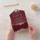 All in one wedding invitation featuring parents' names, botanical greenery rustic leaves, and elegant typography on a rosewood pink background. The invitation includes a perforated RSVP card featuring a QR code. Designed by Thisisnotme©