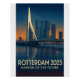 Travel poster design titled "Rotterdam 2025 – Harbour of the Future", featuring the iconic Erasmus Bridge (Erasmusbrug) stretching elegantly across the Nieuwe Maas River