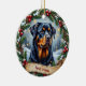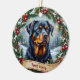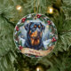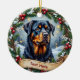 A beautiful, ultra-detailed Christmas ornament design featuring a realistic portrait of the breed centered within a soft, festive winter frame. This elegant design includes pine branches, red berries, and snowflakes against a snowy backdrop, illuminated by warm holiday lighting. The balanced, round composition includes clear space below the dog for customization.