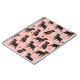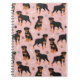 Cute Rottweiler dogs sit and stand with black and tan coats with scattered dog bones and pawprints pattern.