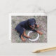This precious postcard features our comical Rottweiler puppy, Heidi. She's lying down on the lawn with a piece of grass in her mouth and a chewed-up Frisbee next to her trying to look innocent. This postcard is sure to bring a smile and be a favourite for any dog lover. She is a sweet and intelligent dog that loves everyone. There is never a dull moment with her around to entertain us.
