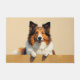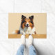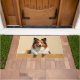 The soft golden sand background adds warmth and elegance, making it perfect for welcoming entryways. Designed with extra space at the top and bottom, it allows easy personalisation with names, welcome messages, or custom text—ideal for unique dog-themed doormats and thoughtful gifts.