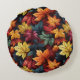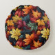 This round shape accent pillow is shown in a lovely colourful autumn leaves print.