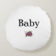 A sweet round pillow for the nursery, this pillow is round and says the word "Baby", under which there is a nice little picture of a small bunch of pansy flowers.