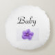 A sweet round pillow for the nursery, this pillow is round and says the word "Baby", under which there is a nice little picture of a violet.
