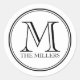 Modern Classic Family Name Monogram round sticker featuring a classic black round border with an editable background colour (click customise it to access) which you can change or leave classic white.