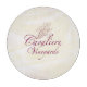 Round glass cutting board featuring the logo from Hunter Cavaliere's winery in Tasting Temptation.