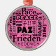 Round shaped Multilingual peace Christmas decoration - pink and black. This is a multiple language peace design I recently updated from an original I created some 25 years ago. It became famous on button badges and postcards as well as shirts. The original was created in Letraset - if anyone remembers that!? Now available again in a variety of image styles for the 21st century!!