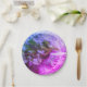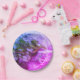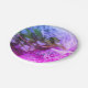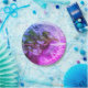 Colours are mauve, blue, green, and white, designed with a garden image photograph.
