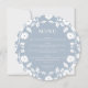 Round wedding menu is designed to delight your guests and set a lighthearted, elegant tone for your special day. Featuring a hand-illustrated folk style white floral frame on a dusty blue background, this menu captures the energy of spring and summer celebrations, or the crisp enchantment of a playful winter wedding.