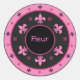 Round stickers in your choice of two sizes, with a fancy fleur de lis design. This one is primarily pink and black, and we added a black background, which you can change if you like. Also change the text in the centre, add your initials, a monogram, a business name, a team name, or just remove the text and leave it blank. The fleur-de-lis is a stylised lily (in French, fleur means flower, and lis means lily) or iris used as a decorative design or symbol. It's a symbol of all things France, and Quebec, and New Orleans and many other places.