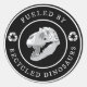 Retro offset-style t-rex skull graphic and Recycle Icon in a round badge style design, with the words, "Fuelled by Recycled Dinosaurs".