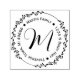 A round address stamp that has a circle design with whimsical petite leaves surrounding the address. The name, street address and city/state/zip code are surrounding the monogram letter of your last name in the middle of the stamp in a circular alignment.