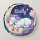 Sweet round pillow with a cute unicorn resting on a crescent moon surrounded by stars and clouds. Personalise with a name for a unique gift idea. Perfect for kids’ bedrooms, pastel lovers, and dreamy kawaii-style decor. Soft, colourful, and magical!