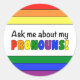 Gender identity can be complicated -- ask me about my pronouns. This design incorporates the rainbow colours of the GLBTQ pride flag. It is a great way to start conversations and raise awareness of gender diversity.