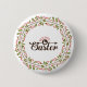 Cute round red and green floral wreath with bunny over white background- Happy Easter. Customisable button template