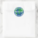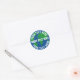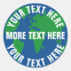 Round planet earth stickers with custom text. Blue and green world map globe logo with white text template. Create stickers and envelope seals for global warming, climate change environmental issues, nature preserve, green energy, forrest protection, protests, plastic soup, recycle, recycling etc. Land sea drawing. Save the planet, save the earth!