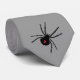 This men's necktie is grey and has a row down the centre of black widow spiders with the classic bright red hourglass marking.