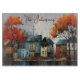A whimsical watercolor of a row of houses in Autumn gives this cutting board a Fall aesthetic. Cutting boards are easy to switch out as seasons change, giving you a fun way to change your home decor. Name can be changed. AI assisted graphic purchased with commercial license. Artwork: RavenPrintableDesign