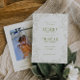 ROWAN Botanical Greenery. Wedding save the date photo card. Features, citrus moss green typography, botanical line art sketch illustration frame and single photo on back.