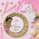 Royal African Princess Pink and Gold Glitter Fancy Paper Plate features adorable ethnic princess wear pink ruffle diaper cover, pink bunny slippers and gold crown; surrounded by gold shimming glitter with pink cursive text.Customise the text as desired. Perfect Royal Princess Baby Shower or Royal Princess Birthday
