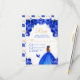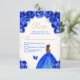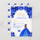 This elegant and glamourous rsvp card features a beautiful princess with brown hair in a royal blue ball gown. The text combines handwritten script and modern sans serif fonts for a classy and sophisticated look. The floral arrangements, butterfly and gold confetti create the perfect blend of rustic and chic. Perfect for a sweet sixteen party or birthday party.