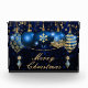 Royal Blue and Gold Christmas Baubles ornaments design with a dark blue bokeh background
