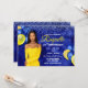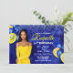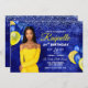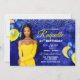 Invitation designed for birthdays, sweet sixteen, weddings, anniversaries, bachelorettes, and other party events with a royal blue and yellow theme, highlighted by bunch of balloons in these colours at the corners on a background of blue glitter and metallic foil.