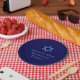 This custom royal blue Bar Mitzvah party square paper plate has a beautiful, artistic Star of David drawing at the top. Complete the decor with your personalised name on the decoration.
