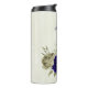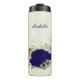 Beautiful romantic thermal tumbler featuring royal blue and beige flowers and some leaves .
