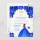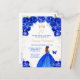 This elegant and glamourous birthday party invitation features a beautiful princess with brown hair in a royal blue ball gown. The text combines handwritten script and modern sans serif fonts for a classy and sophisticated look. The floral arrangements, butterfly and gold confetti create the perfect blend of rustic and chic.
