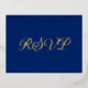 For one side of this wedding response card "RSVP" is in gold text that sits on top of a royal blue background. The other side provides the recipient with a small form to complete prior to mailing the RSVP card.