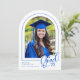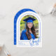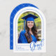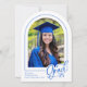 Featuring a chic arch-shaped photo, this announcement perfectly a feminine design with the classic colours of royal blue and white. FRONT: "Grad" is shown in a handwritten script and partially overlays the arch-shaped photo. Personalise the template with your grad's photo, first/last names, school name and last two digits of their graduating year. BACK: A geometric pattern with simple hand-drawn bows. © Kimbellished, LLC