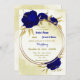 Beautiful wedding invitation featuring Royal blue flowers and gold leaves on an elegant gold geometric frame