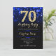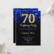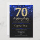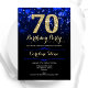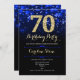 70th birthday party invitation. Elegant royal blue design with faux glitter gold. Features stylish diamonds, bokeh lights and script font. Men or women bday invite. Perfect for a stylish adult birthday party. Personalise with your own details. Message me if you need further customisation. Printed Zazzle invitations or instant download digital printable template.
