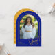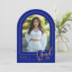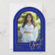 A clean and graceful design that incorporates school colours in royal blue and golden yellow. FRONT: "Grad" is shown in a handwritten script and partially overlays the arch-shaped photo. Personalise the template with your grad's photo, first/last names, school name and last two digits of their graduating year. BACK: A geometric pattern with simple hand-drawn bows. © Kimbellished, LLC