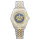 Beautiful gold crown emblem with textured, royal blue plating, surrounded by a gold, circular border layered on a golden gradient background.