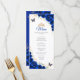 Royal blue, gold and white Quinceanera celebration slim menu card. Features, script font, gold butterflies, watercolor roses and tiara. Perfect for an elegant princess style glam celebration. Personalise with your own details.