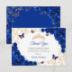 Royal blue gold Quinceanera celebration thank you card. Features, script font, butterflies, watercolor roses and tiara. Perfect for an elegant princess style glam celebration. Personalize with your own details.