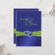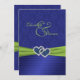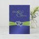 Add some sparkle to your wedding or special celebration with this invitation royal blue and green damask wedding invitation with pleated LOOK and a green PRINTED ON ribbon and a pair of blue FAUX glitter and diamond jewel joined hearts on it, shown here on basic paper. There is a front monogram area that you can change out to suit your needs, or remove it entirely if you prefer that. All the text is customisable and so are the paper choices. If you require any other items in this same design, Existing matching items are shown below.
