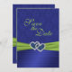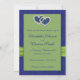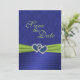 This royal blue and lime green double hearts with PRINTED on ribbon and jewels Save the Date card matches the invitation and other items shown below. The text is all customisable and so are the paper choices. If you require any other items in this same design, such as photo cards, reception cards, wedding bulletin, table cards etc., please email me your request. Existing matching items are shown below.