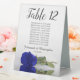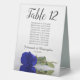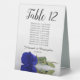 These tent table number signs are not only beautiful, they even include a list of names for the guests at each table, making it easy for your guests to find their seat at your wedding reception. The design is both elegant and romantic featuring a single royal blue or cobalt coloured rose lying on its side reflecting in water with waves and ripples. The title is in lacy script calligraphy with bold numbers so your guests can easily find the right table. There is room for the names of the couple and the wedding date.